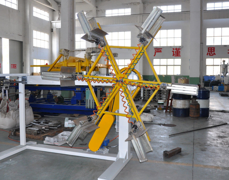 Αυτή η ζαρωμένη γραμμή εξώθησης σωλήνων signle τοίχος περιέχει κυρίως τον εξωθητή, που ζαρώνουν διαμορφώνοντας τους φραγμούς μηχανών, κεφαλιών κύβων και φορμών, δροσίζοντας εξοπλισμός, μετρώντας μηχανή και άνεμος η μηχανή. Μπορεί συνεχώς να παραγάγει πολλά είδη διαμέτρου που ο ενιαίος τοίχος ζάρωσε τους σωλήνες.