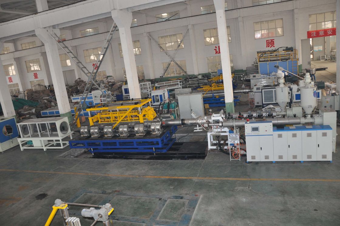 Η πρώτη ύλη + πρόσθετο → που αναμιγνύει τον κενό στεγνωτήρα χοανών μηχανών → σίτισης → → ενιαίος εξωθητής βιδών για τον υλικό/διπλό εξωθητή βιδών PE/PP για τον κύβο εξώθησης σωλήνων PVC material→ + ζάρωσε το σωλήνα διαμορφώνοντας die→ διαμορφώνοντας machine→ την έλξη από την τέμνουσα μηχανή μηχανών →