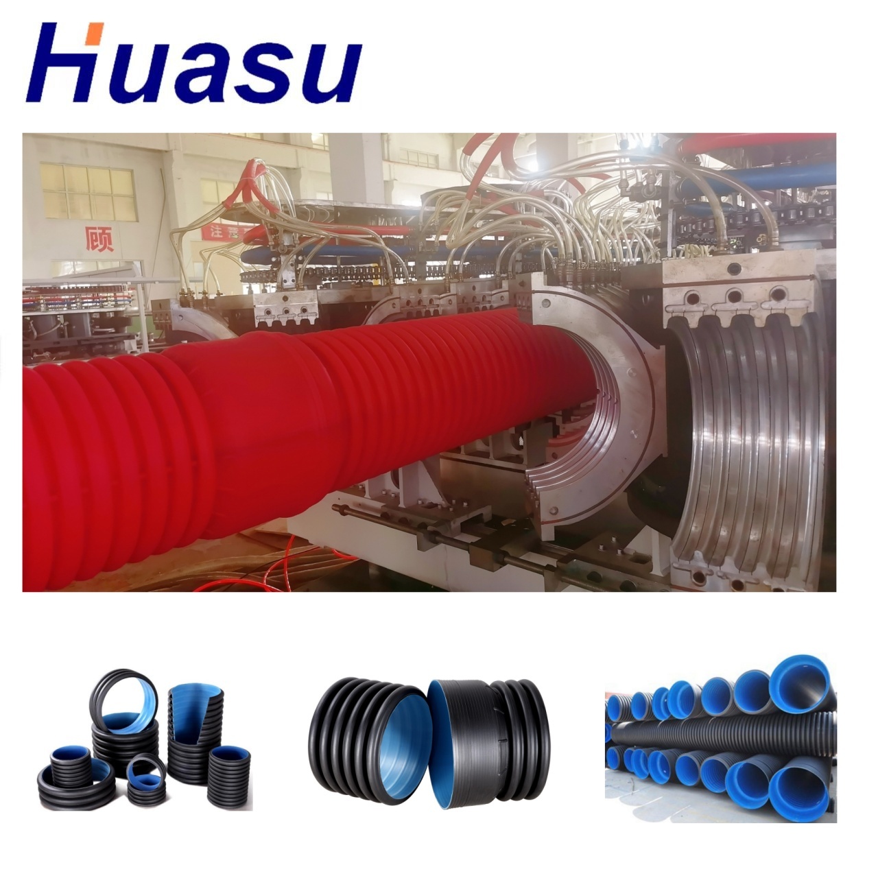 The HUASU Double Wall Corrugated Pipe Extrusion Line (Model: SBG) is manufactured in China with ISO and CE certifications, ensuring compliance with international quality standards.